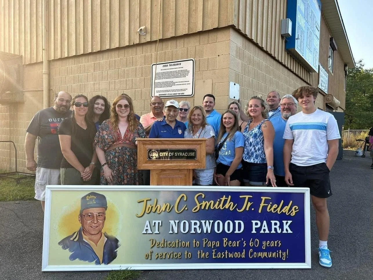 In August, the City of Syracuse thanked John for his service to the community by renaming the Norwood Park football field the “John C. Smith, Jr. Fields at Norwood Park.” Although he is not officially involved anymore, last week, John’s son Jeff, drove John to the field to watch the now Eastwood Grizzlies practice from his car. The team’s name was changed to mark the end of an era when John retired.